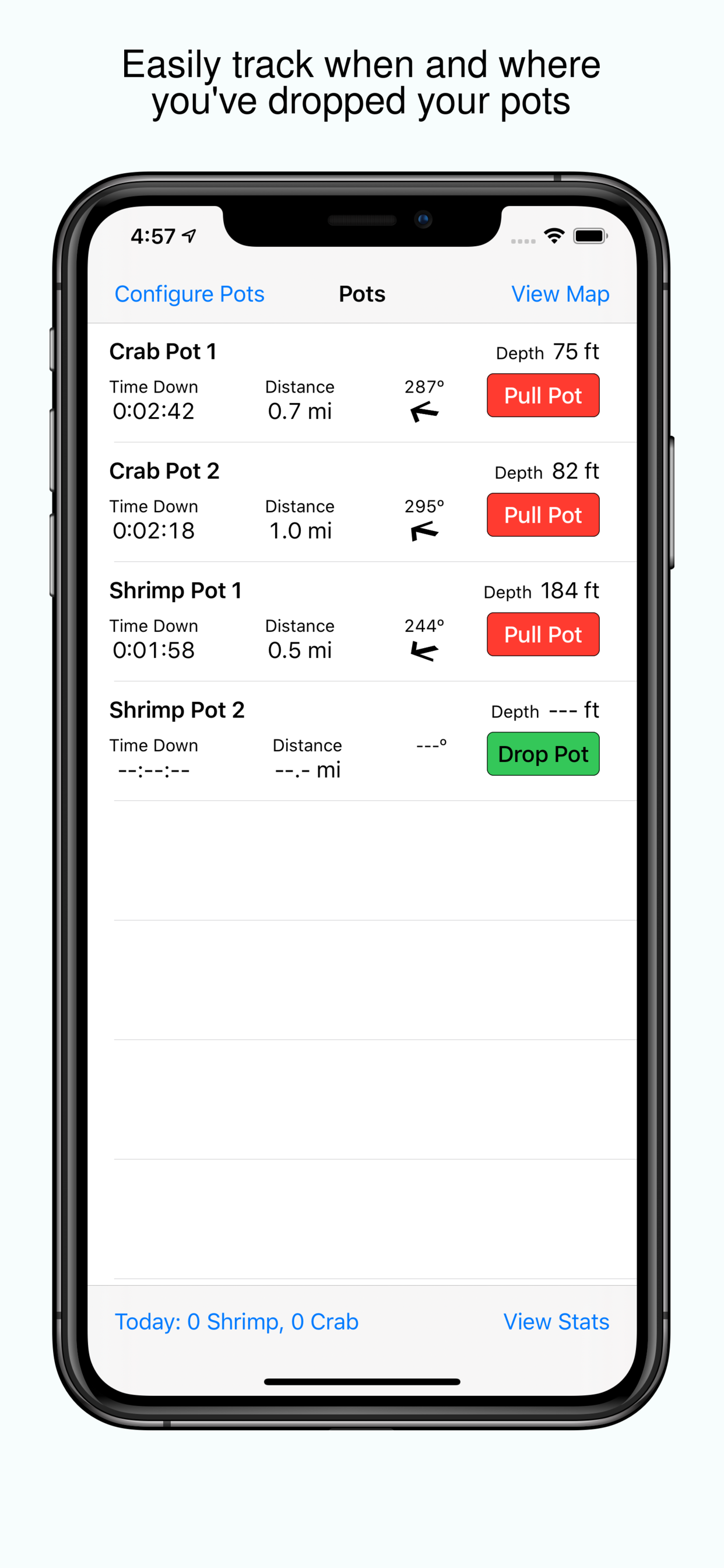 Crab and Shrimp Pot Tracker allows you to easily keep track of where your pots are, how long they've been down, and how many shrimp and crab you've caught.